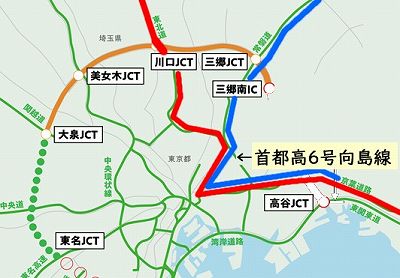 常磐道と東北自動車度は埼玉方面の道路で、京葉道は千葉の道路だから、このルートを走る車が、首都高6号向島線に流れ込んでいたわけだね。