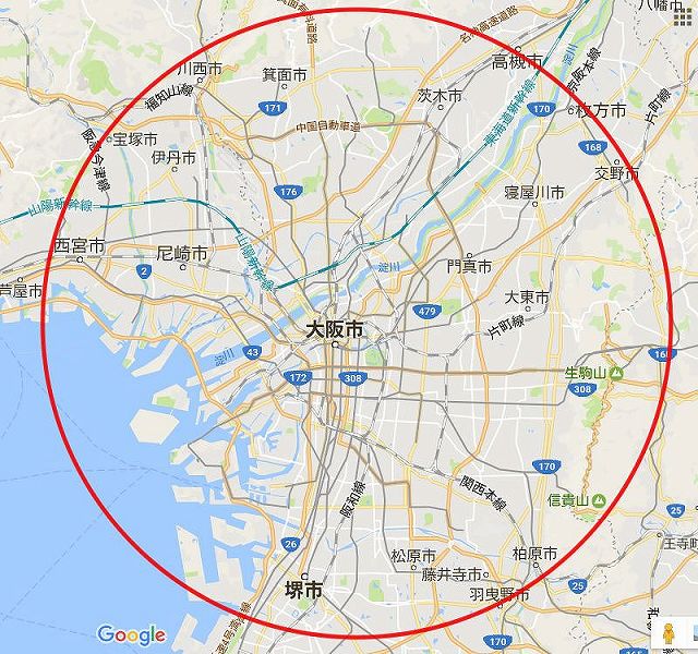 グーグルマップ上に、半径15kmの赤い円を描いてみると下のようになる。